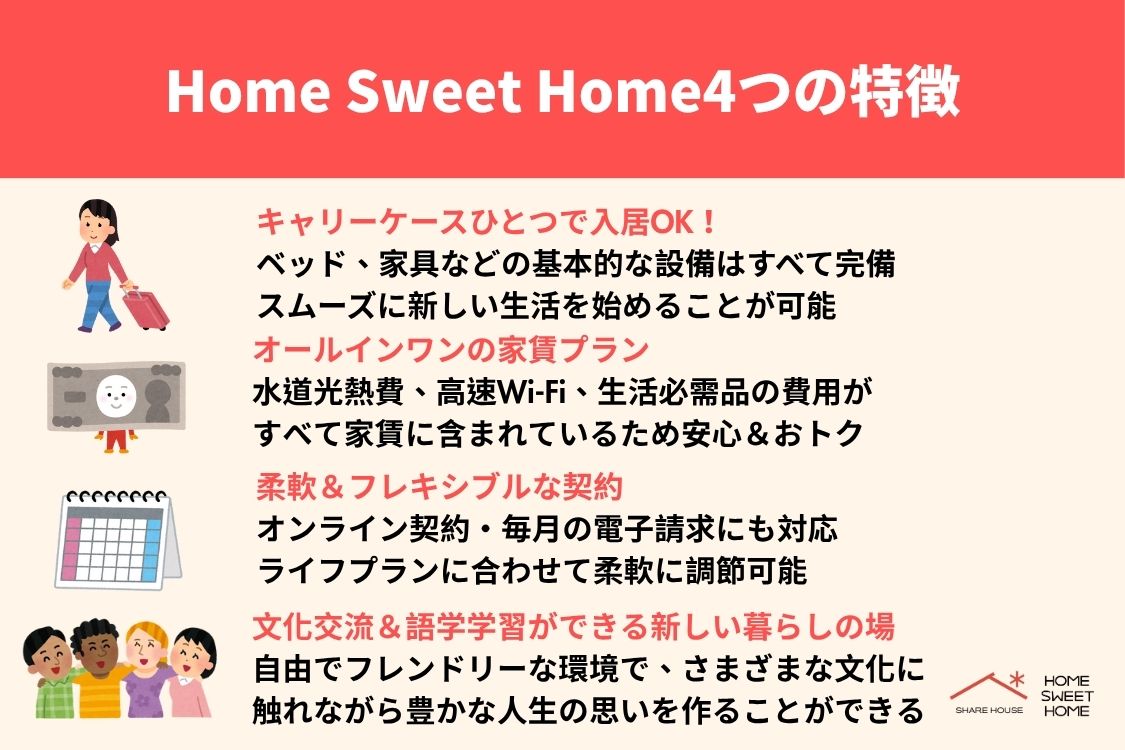 Home Sweet Home | $14,500–$18,000(すべて込み) | 専用カスタマーサポート/修繕対応も速い | 家具・家電完備/シンプルで快適/冷房も新しい | 程よい距離感/交流もできるがプライバシー重視 | 駅徒歩3–5分/便利な好立地に複数拠点あり | 家賃にすべて込み(水道、電気、ガス)追加料金なし |